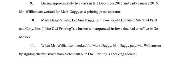 In his suit, Eugene Williamson, the former employee, noted he was working as a pressman for Daggy’s Acme Custom Print business, but his paychecks came from Nite Owl Print and Copy, a separate incorporated business registered to Mark Daggy’s wife, LeeAnn.