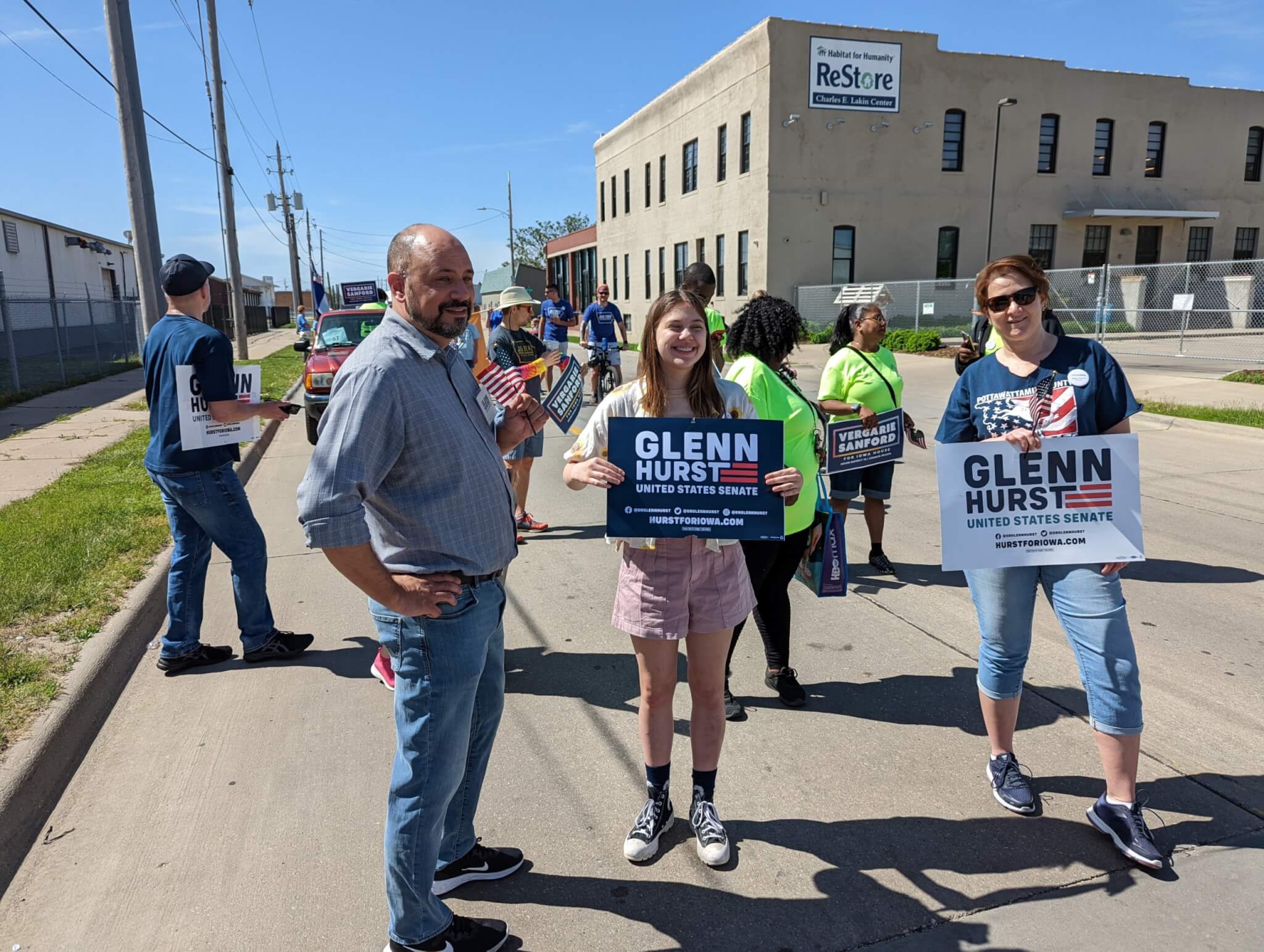 The parade route makes a hairpin loop through downtown Council Bluffs and after walking about half the route before the parade started, Hurst has to head back to the Pottawattamie County Democrats staging area to meet his family. His wife, Rhonda Noel-Hurst, and their 14-year-old daughter Tierney Coughlin join him for the main event.