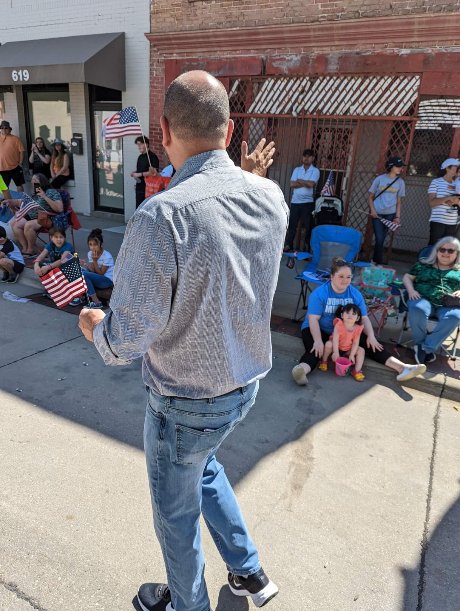 Still, while he has plenty to say about his opponents during one-on-one conversations with a reporter, during interactions with potential voters along the parade route he never mutters a word about them. He tells people who he is, what office he’s running for, what he stands for, and when the primary is. Hurst doesn’t even specify to vote for him, he just tells people to go vote.