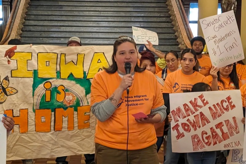 Martinez shared their story on Wednesday at a rally inside the Iowa State Capitol rotunda that was put on by the Iowa Migrant Movement for Justice (MMJ), of which Martinez is a board member. A couple of dozen supporters clad in orange T-shirts and supportive signs joined them.
