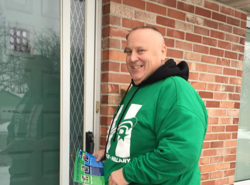 Organizing for the caucus with paid staff and local volunteers in multiple offices across the state, the AFSCME green shows up often at Clinton events, but even more on members’ doorsteps. AFSCME President Lee Saunders has been traveling across the state this week to meet with members and encourage them to caucus for Clinton. Yesterday he stopped by the Iowa Veterans home, where they spoke to members and delivered some gifts to veterans, did a press conference at a church with Tom Harkin on child care, and stopped by a Polk County building.