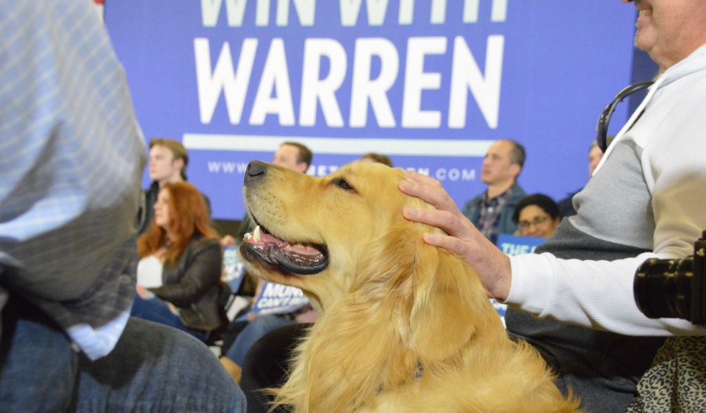 On Sunday, Warren appeared before one of her most enthusiastic audiences here in months, with around 900 people packed into the NewBo Market in Cedar Rapids. Jonathan Van Ness, star of Queer Eye, helped rev up the crowd beforehand. Also joining her on this Iowa swing was her dog Bailey, who commanded his own selfie line after events.