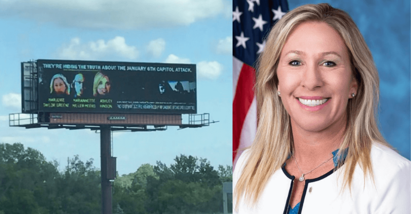The Democratic Congressional Committee put up a billboard ad today near the I-80/I-35 interchange, ahead of Greene coming to Iowa tomorrow. It reads “They’re hiding the truth about the January 6th Capitol attack,” with a photo of Greene next to ones of Hinson and Miller-Meeks.