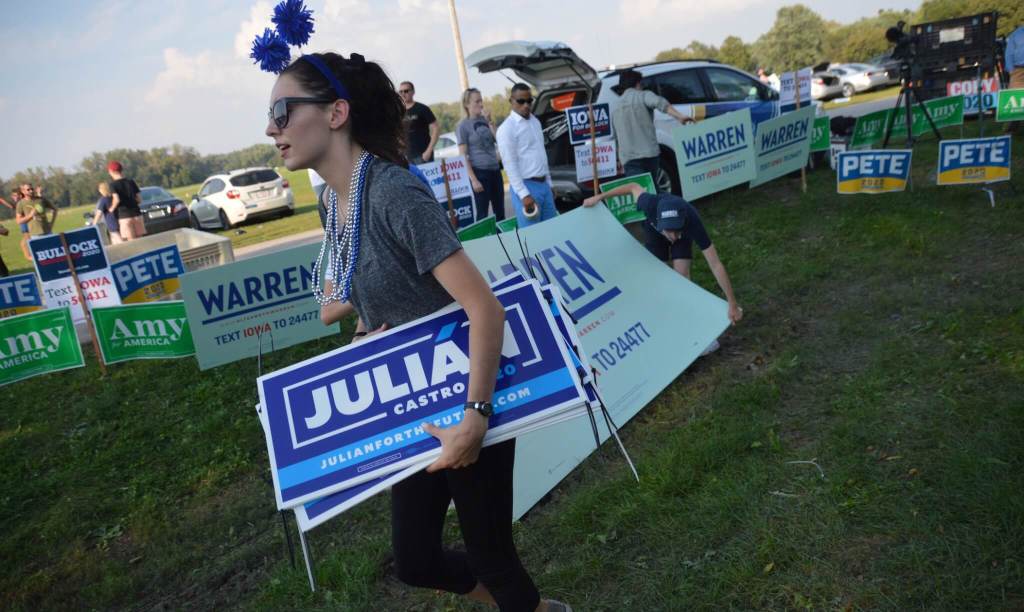 The sign wars got kicked off early, with campaigns swarming the Des Moines Water Works grounds mid-afternoon yesterday to begin placing miles of yard signs on the roads leading into the Steak Fry. Beto O’Rourke’s team dominated a long stretch of the main road for attendees, while Biden signs will greet people all the way out on Fleur Drive, two miles out. Kamala Harris opted to win the main intersection that people will drive in on.