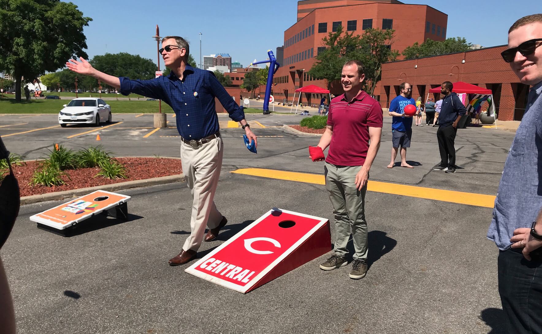Hickenlooper was the first candidate to stop by the Safe Schools Tailgate to play some games and chat. He spoke with organizers and teens before joining the action for a cornhole game and taking a turn at giant Jenga – which he did without knocking over the stack.