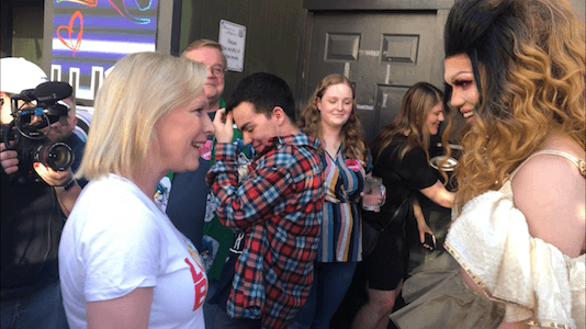 Wearing a “Love Is Brave” t-shirt, she entered the Saddle to cheers, then set up behind the bar to take drink orders.