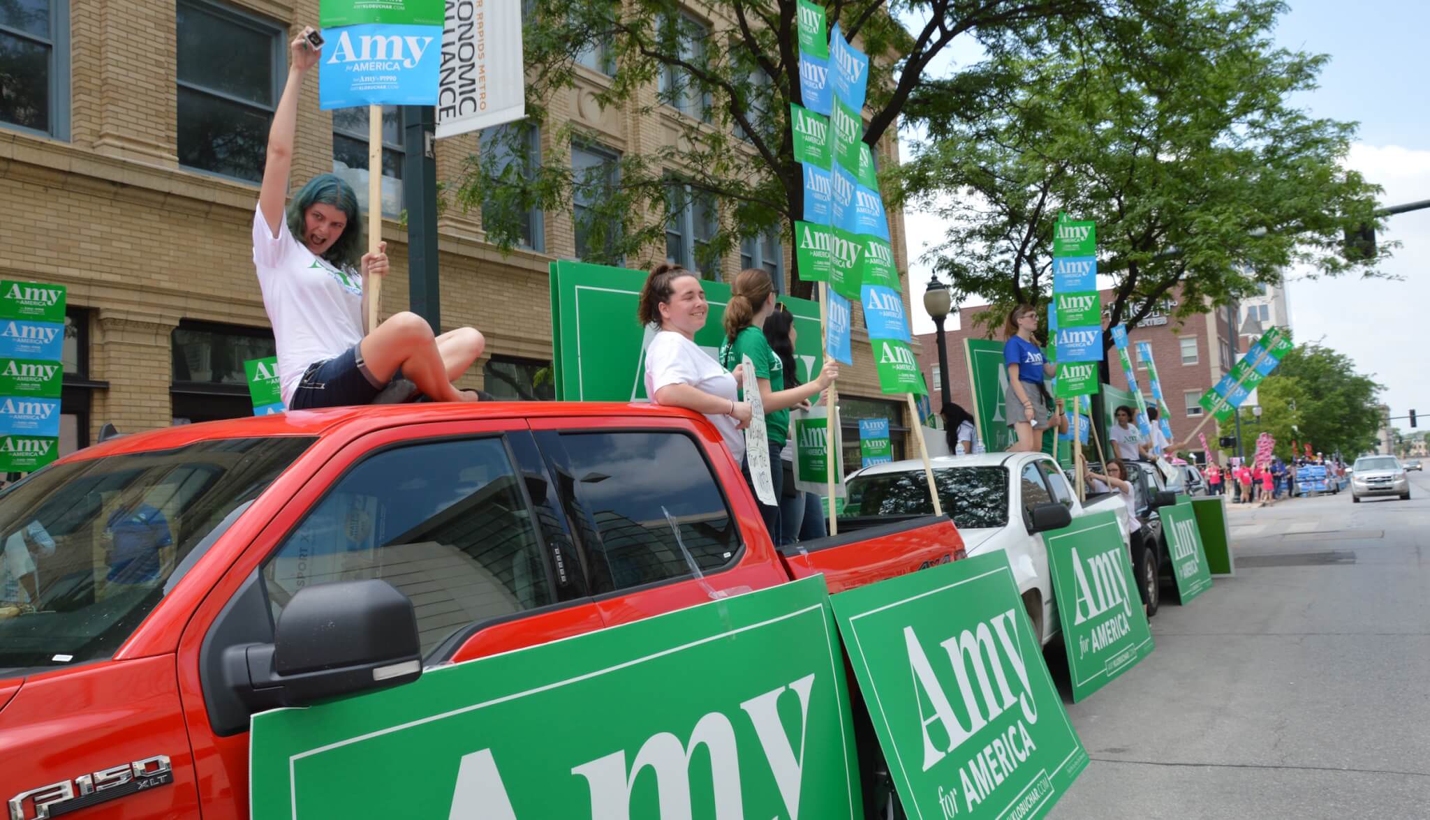 Amy Klobuchar’s green-clad contingent blasted music before the event, holding a dance party of sorts on the beds of their pickup trucks.