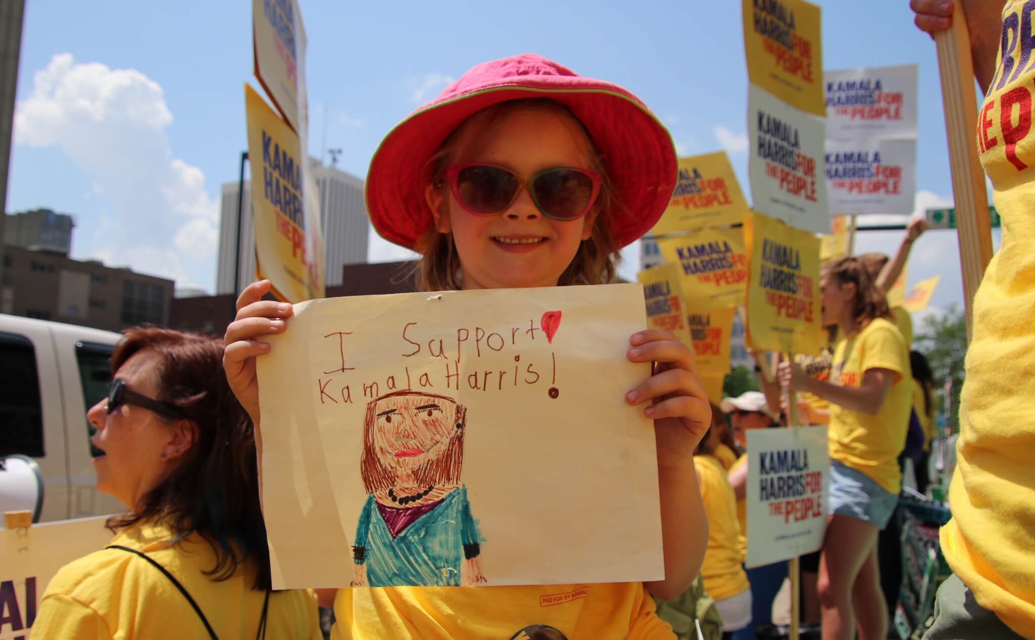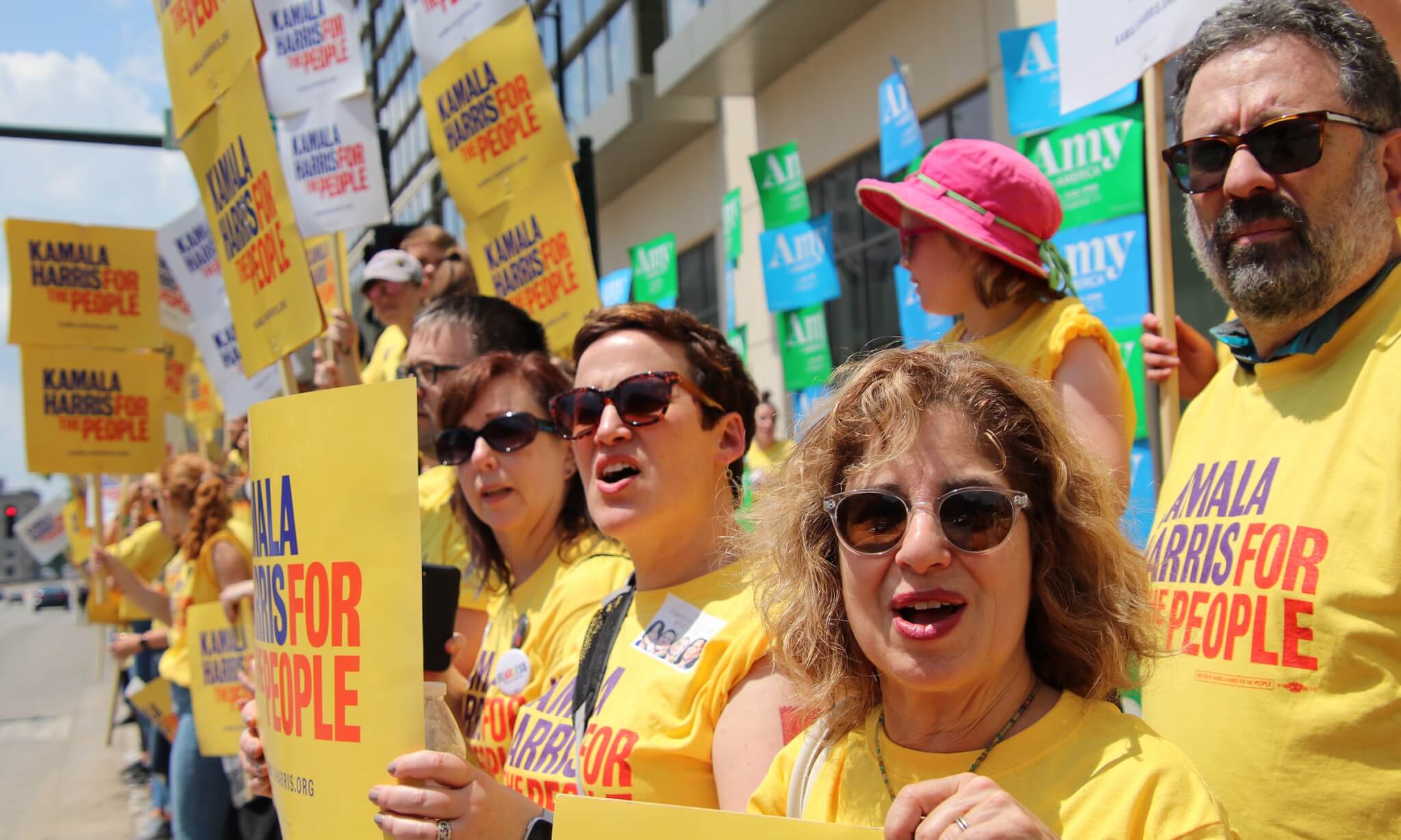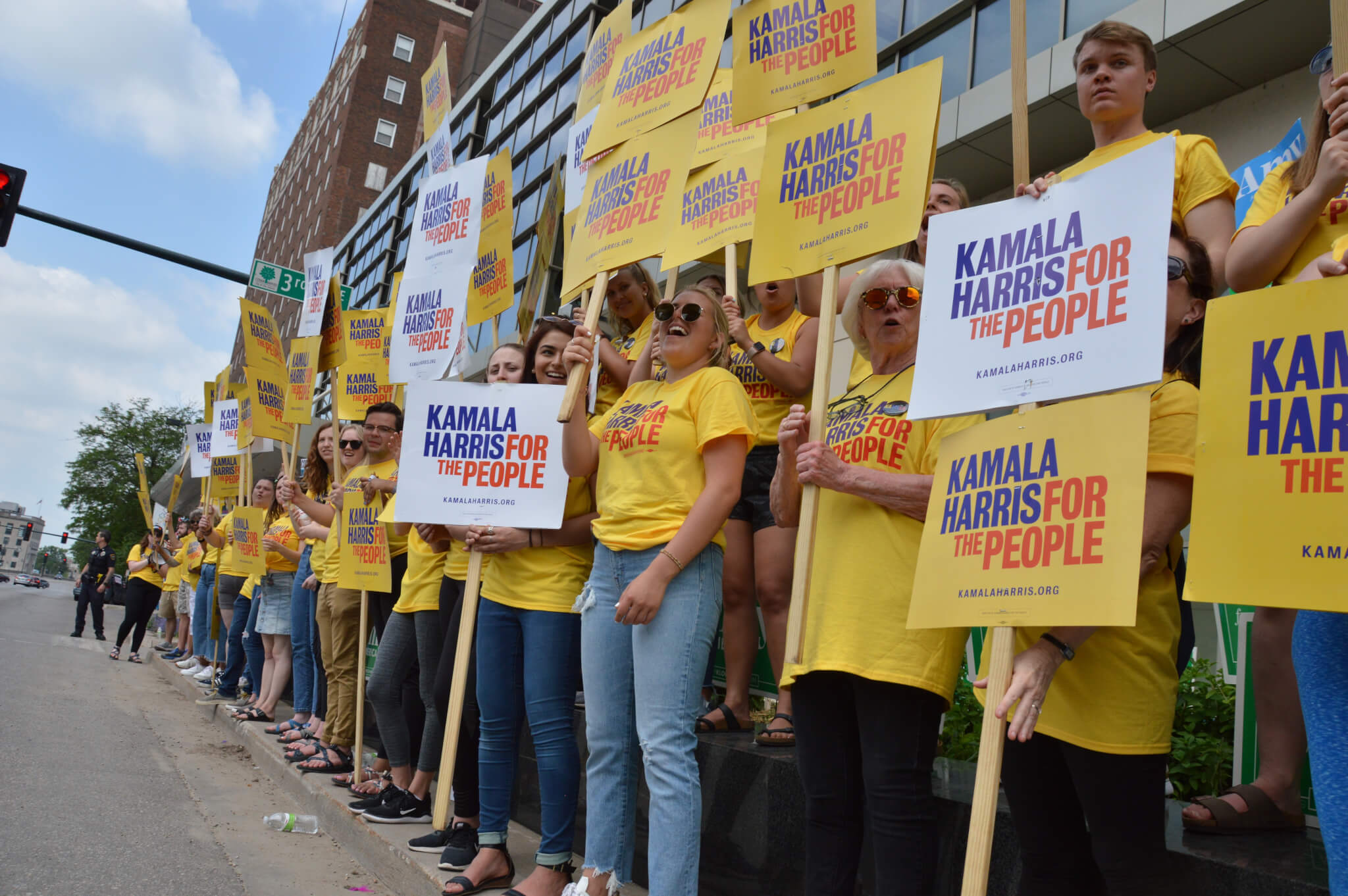 The sign-waving festivities kicked off before the sun came up – Kamala Harris’ team arrived at 5:00 AM to start their chants (to an empty street). They staked out the street space closest to the event entrance and fielded a large group of staff and volunteers, standing out in their bright yellow t-shirts.