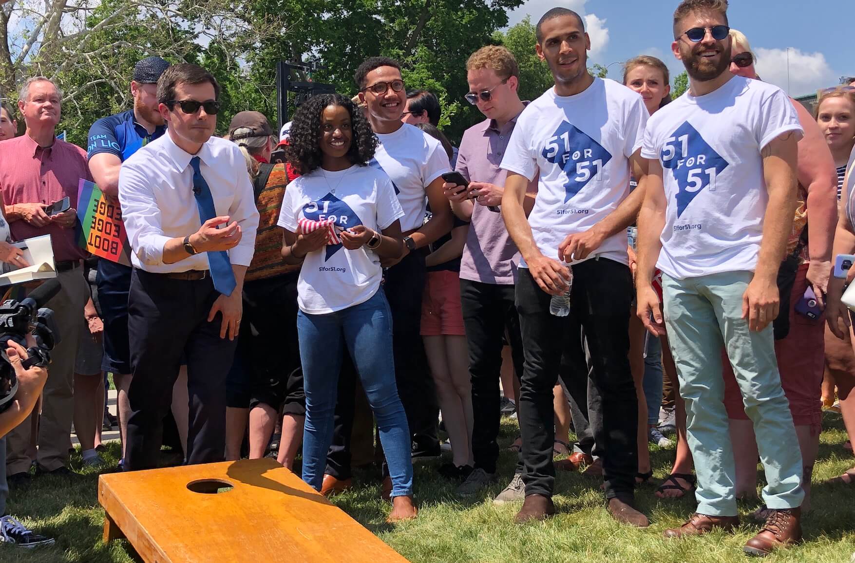 From the stage, the mayor tossed bags in a game of cornhole, played the piano on stage and met supporters.