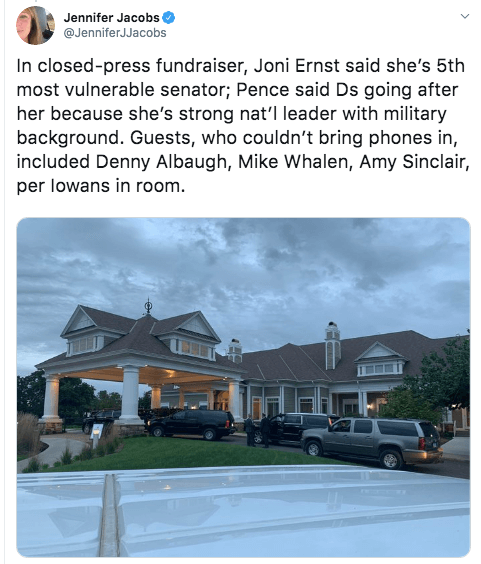 Pence came to Iowa for a major speech about the USMCA trade deal, then stuck around that evening for a fundraiser for Ernst. As Bloomberg’s Jennifer Jacobs reported, the event was closed to the press and attendees were even barred from bringing in their phones, presumably to prevent any recordings of the night from getting out.