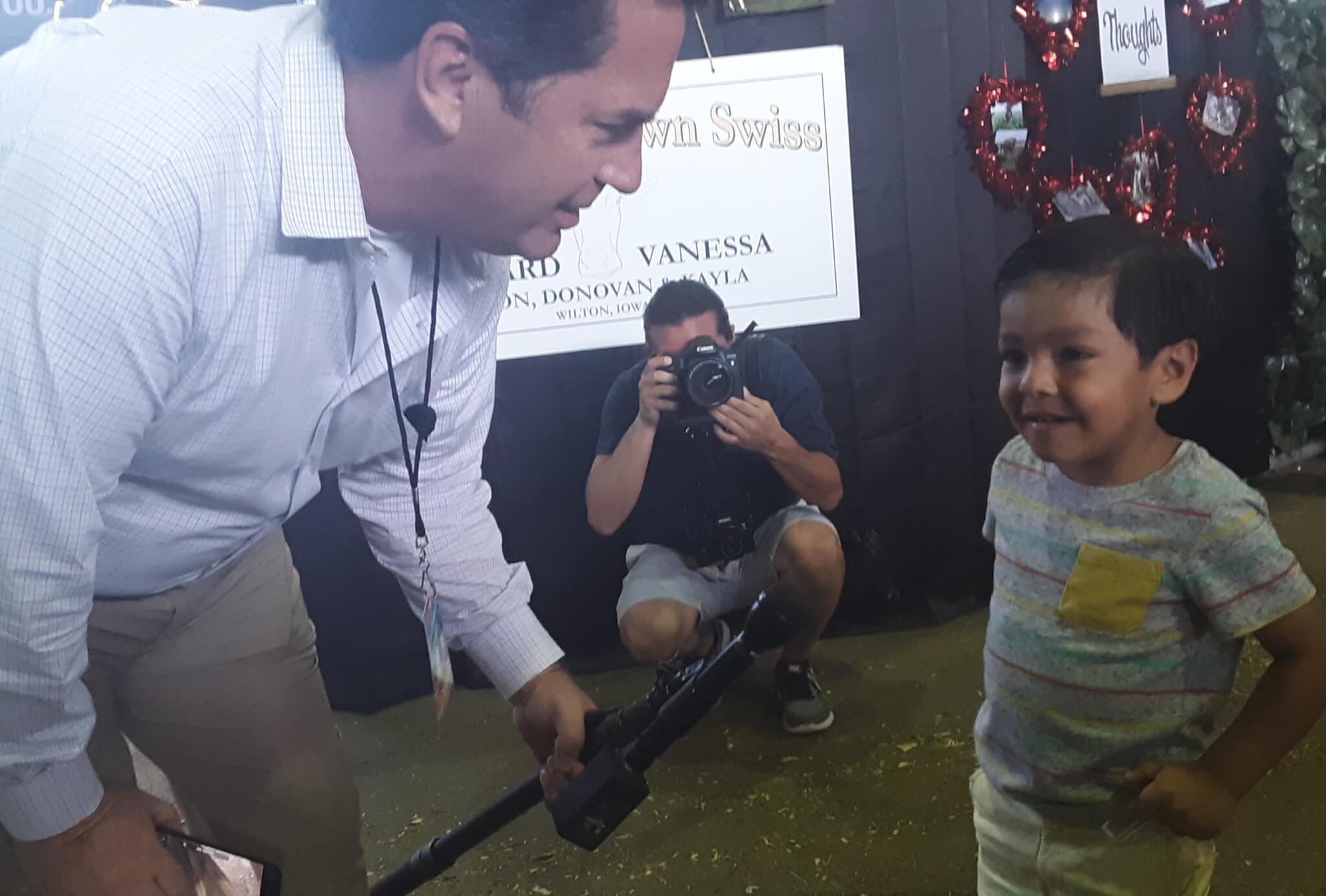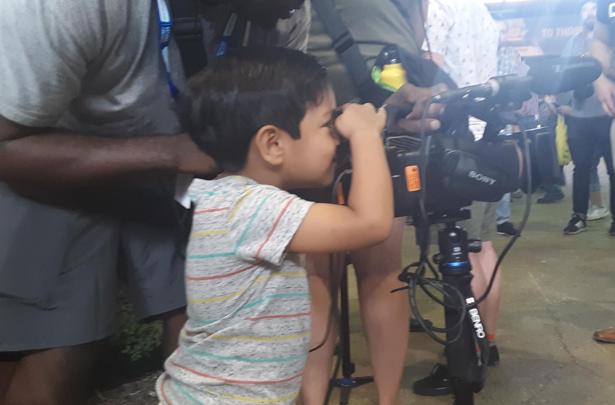 He had some fun figuring out what a television reporter sees through his camera. And he even grabbed a microphone and was willing to do a short interview before his dad swooped him away.