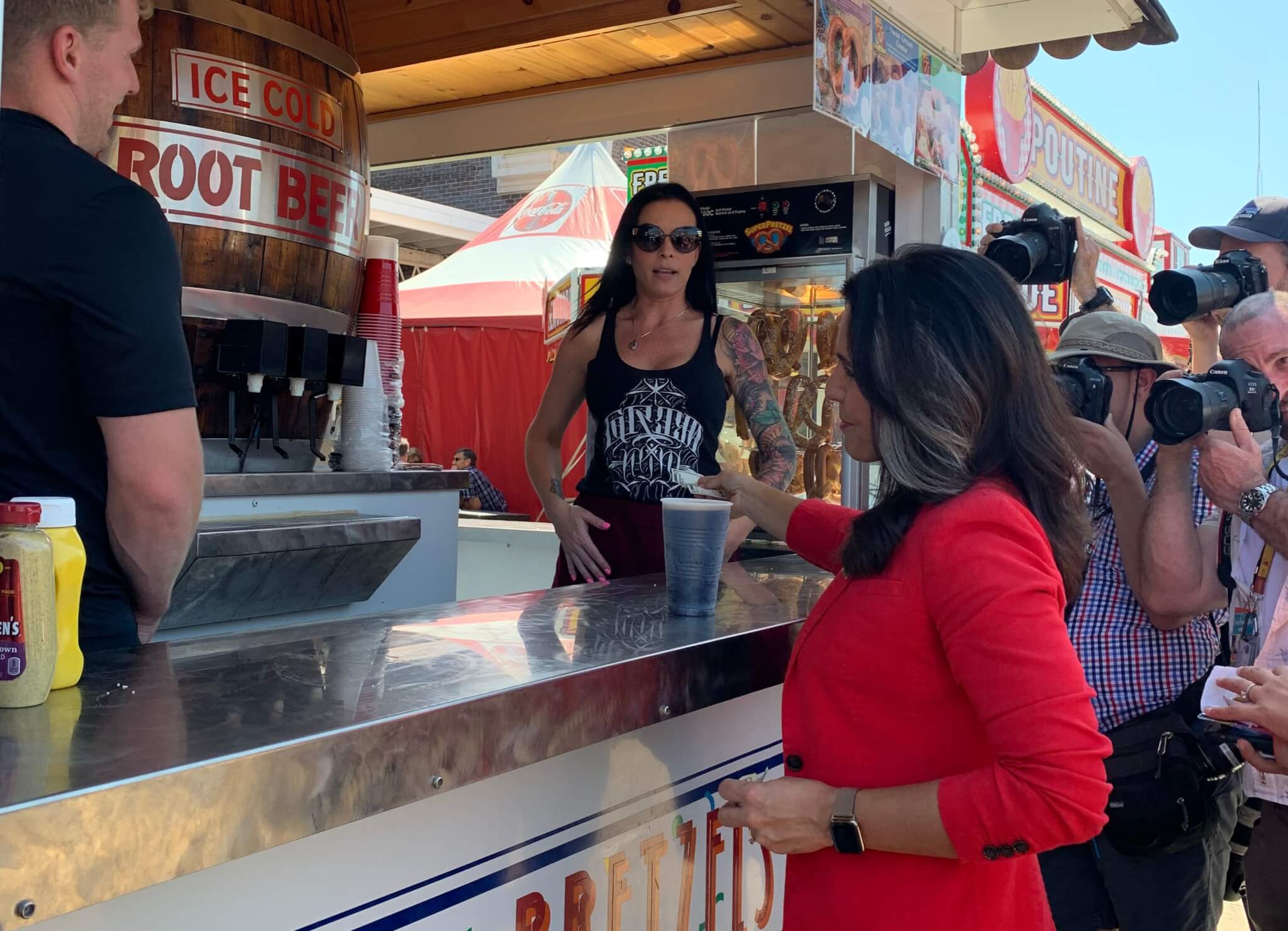 Former HUD Secretary Julian Castro brought his entire family to the Iowa State Fair, while former Congressman John Delaney flipped some burgers and Congresswoman Tulsi Gabbard grabbed a root beer. Meanwhile, Andrew Yang gnawed on a giant turkey leg and Marianne Williamson met voters at the Iowa Democratic Party’s booth.
