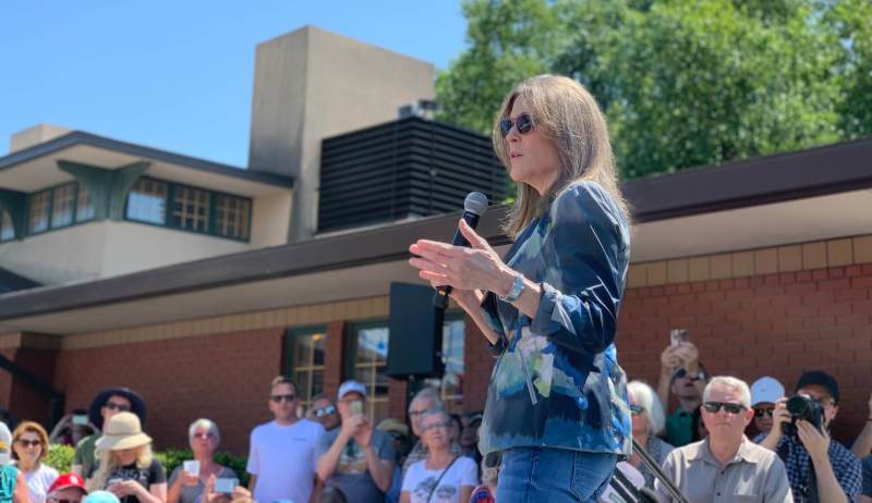 A pretty large crowd had amassed around the Soapbox more than ten minutes before her speech. Williamson received a warm welcome as she kicked off her speech.