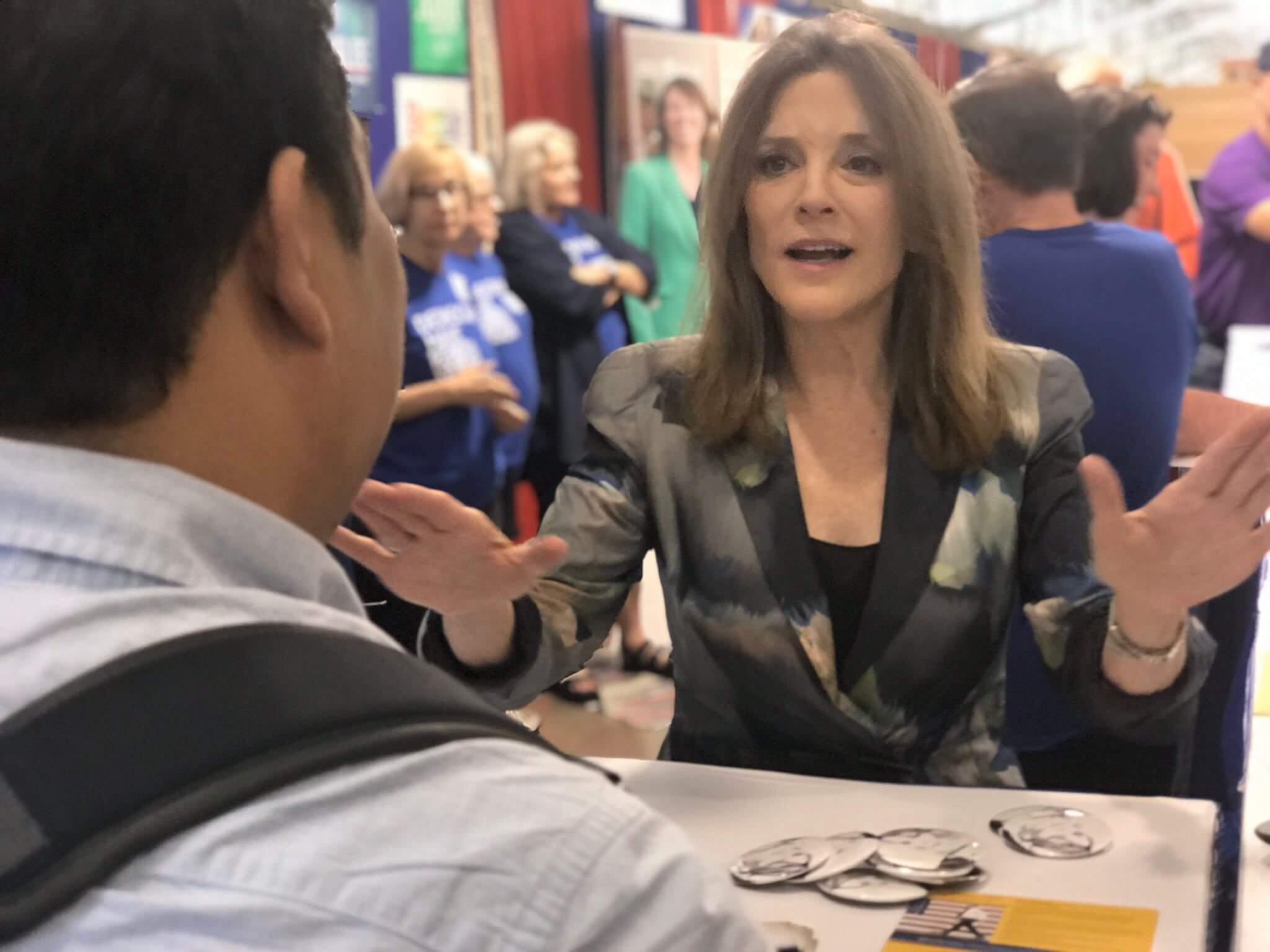 Williamson spent some time at the Iowa Democrats booth, talking to voters, answering their questions and signing autographs. She was at the booth or right outside it doing interviews for almost an hour leading up to her speech.
