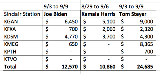 Meanwhile, while candidates tout the importance of local journalism, several of their campaigns spend tens of thousands of dollars weekly on Sinclair-owned TV stations in Iowa and elsewhere across the country.
