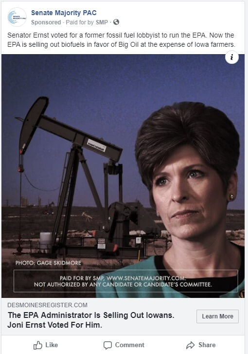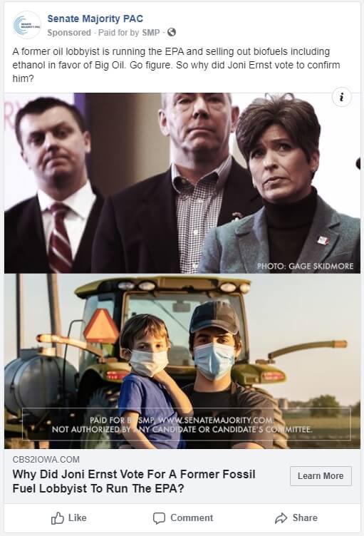 Today, Senate Majority PAC weighed in on the issue with a spate of new digital ads focused on Ernst’s “record of selling out Iowa farmers and the ethanol industry while in Washington.”