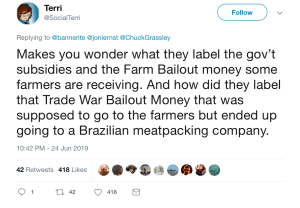 “Makes you wonder what they label the gov’t subsidies and the Farm Bailout money some farmers are receiving,” wrote ‘Terri.’