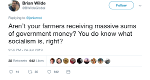 ‘Devin Nunes’ cow’ jumped in on conversations on farm subsidies, as did Twitter user Brian Wilde, asking Ernst, “Aren’t your farmers receiving massive sums of government money? You do know what socialism is, right?”