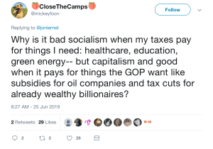 “Why is it bad socialism when my taxes pay for things I need: healthcare, education, green energy,” asked ‘CloseTheCamps,’ “but capitalism and [sic] good when it pays for things the GOP want like subsidies for oil companies and tax cuts for already wealthy billionaires?”