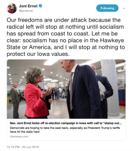 “Our freedoms are under attack because the radical left will stop at nothing until socialism has spread from coast to coast,” Ernst said in June 20 tweet. “Let me be clear: socialism has no place in the Hawkeye State or America, and I will stop at nothing to protect our Iowa values.”