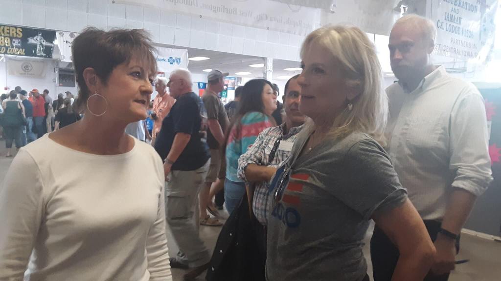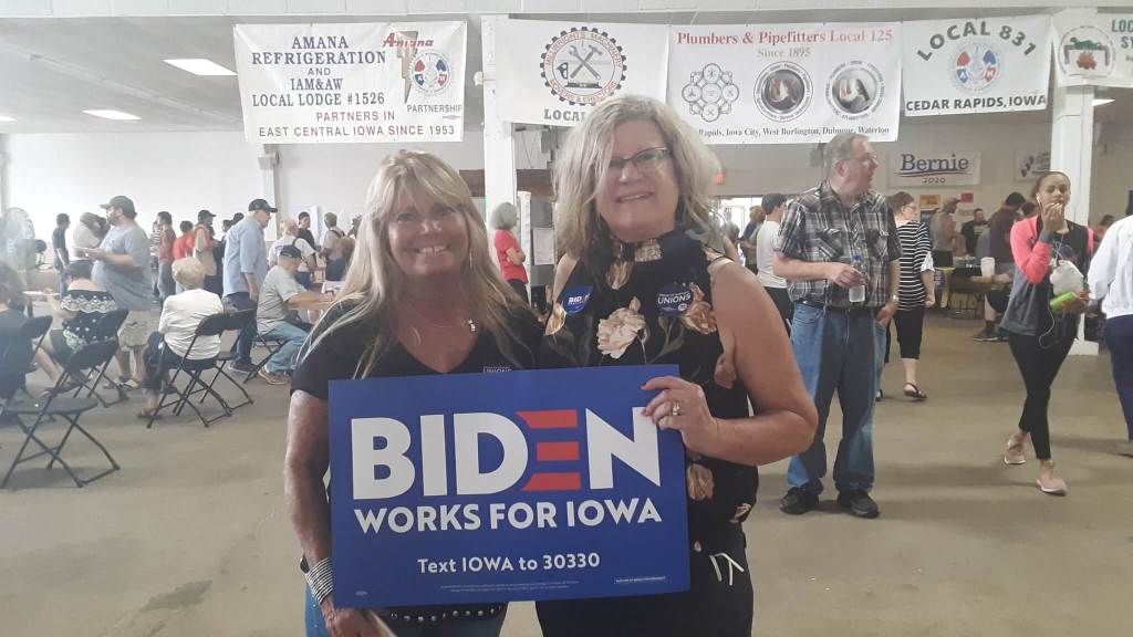 Deb Barger and Char Jaeger, both 46-year union members who retired from Rockwell Collins Aerospace, were holding signs and happily showing their support for the former Vice President.