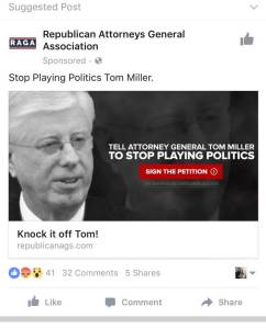 Iowa Republicans have launched an all-out assault on Miller’s credibility, decrying him as a partisan hack who made his decision simply because he’s a Democrat who wanted to cause problems for a Republican. Both Branstad and Reynolds put out sharply-worded statements immediately afterward, the state party has sent out many press releases hitting him and party leaders have taken to the TV shows and editorial pages to blast Miller. The Republican operative network has finally been out in full force once again on social media, motivated in a way I haven’t seen since the Bruce Braley campaign. And the state party even filed an open records request for the Attorney General’s office to obtain internal communication on the matter to see how it was decided.