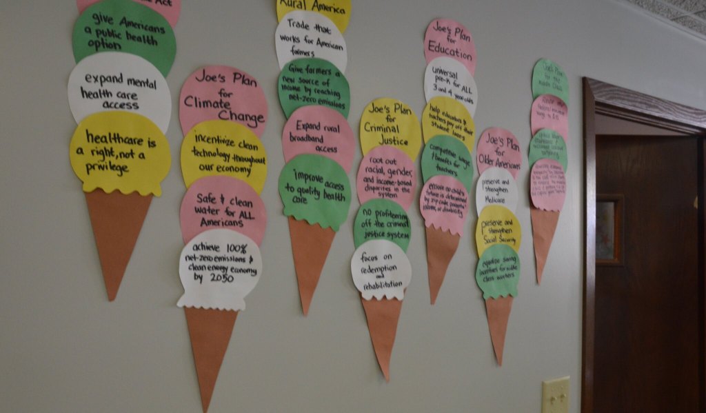 The inside of the office was decorated with on-brand ice cream cone and Aviator shades paper cut-outs on the walls. Outside, experienced activists, along with some well-known local endorsers like Polk County Mary Maloney, turned out for some BBQ and to sign up for volunteer shifts with the local field organizing team.