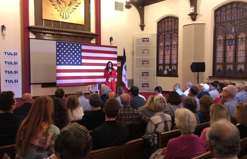More than 100 people filled the pews and stood in the back of the hall to see Gabbard, polling at 2% in Iowa.