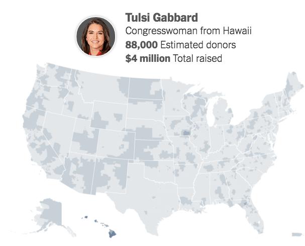 A New York Times graphic of financial support for presidential candidates showed some of the highest concentration of donations in the country for Gabbard and Williamson came from in and around Fairfield.
