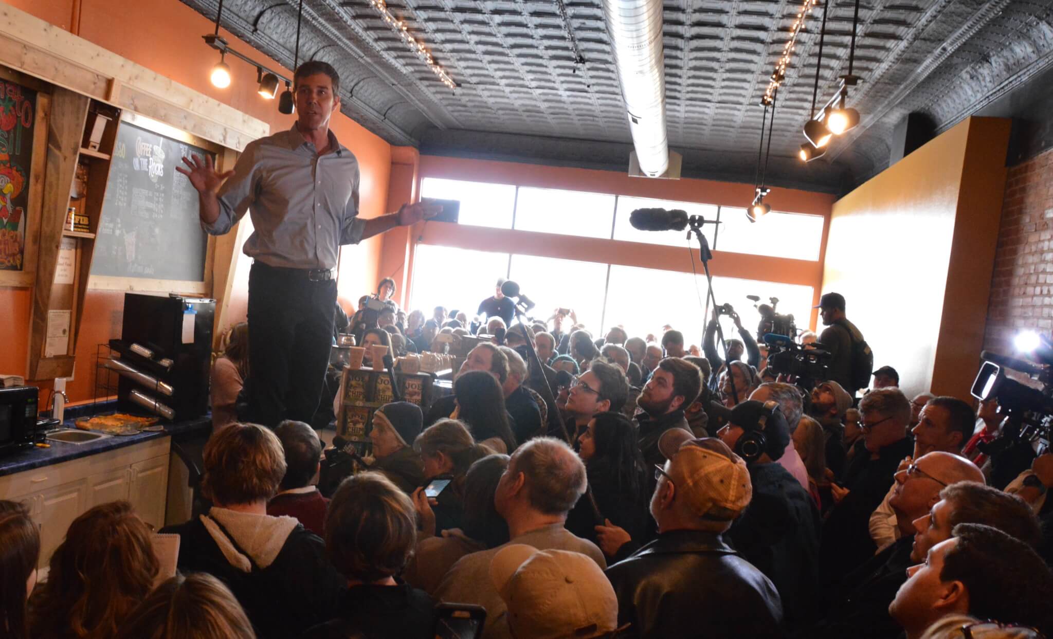 There was a feel of chaotic creativity to O’Rourke’s seat-of-his-pants campaign style during his first visit to Iowa. Many locals didn’t know the new candidate was visiting their town until just a few hours before, and much of that information traveled by word-of-mouth. His very first stop seemed to have more reporters at it than Iowans; by the end of his second day, so many people were showing up to his coffee shop/bar visits that the crowd also filled up the overflow spaces.