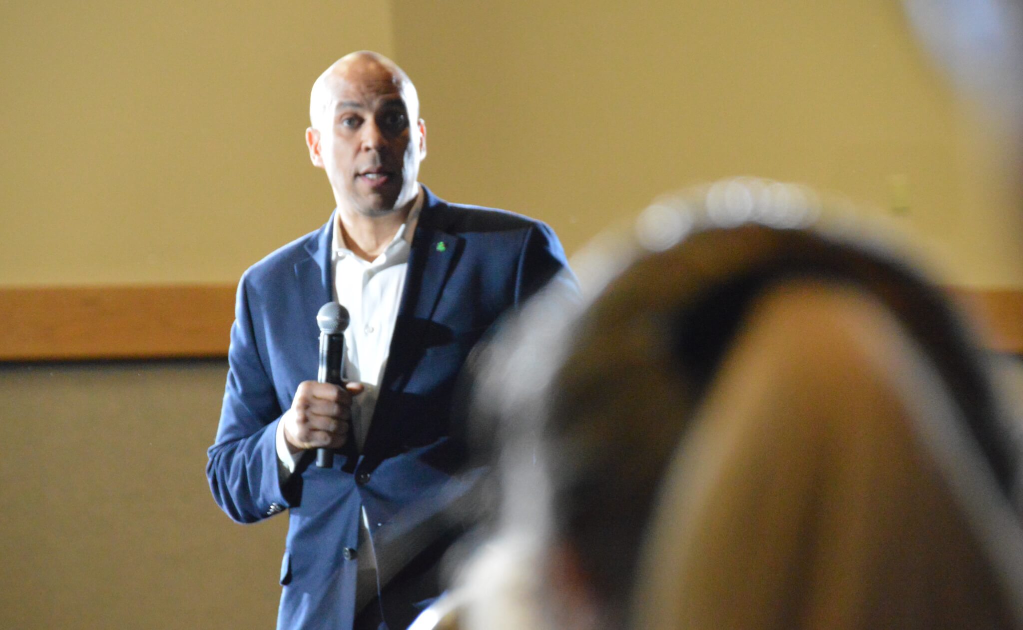 But there’s certain ones where it’s fun to watch the audience members instead of the candidate. When Booker talks about American “tolerance” and why it’s not enough, he has a line that goes, “Try going home tonight and telling someone that you tolerate them.” I scan the crowd during this one, because there’s always a few middle-aged husbands or wives who get a smile on their face, glance over at their partner sitting next to them, and give them a little elbow nudge.