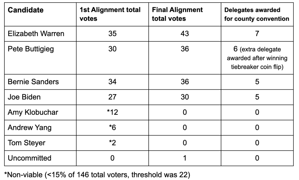 Although leaning toward Bernie Sanders, he chose not to realign, which meant that after doing the final count, it went to a coin flip tie-breaker between Sanders and Pete Buttigieg, which Buttigieg won. In this particular scenario it awarded one more delegate to Buttigieg to go on to the county convention. So, to those who still think and may say, “one vote doesn’t matter,” it truly does still matter.