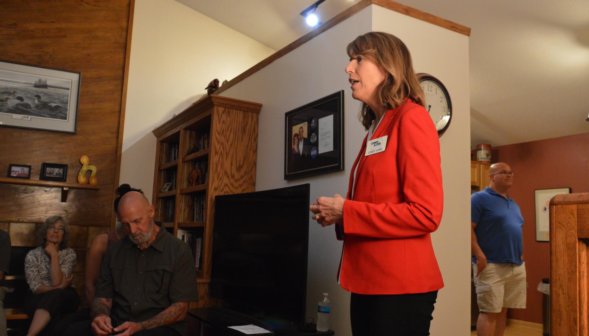 To that end, she hosted her 100th house party in West Des Moines this past week, finishing out her district-wide goal to meet as many people in these small settings as possible. About 30 people packed into a living room, the kitchen and a hallway at this particular house party. A few attendees were ones that Axne had met several times on the campaign trail, but many were just seeing her for the first time, one week out from the election.