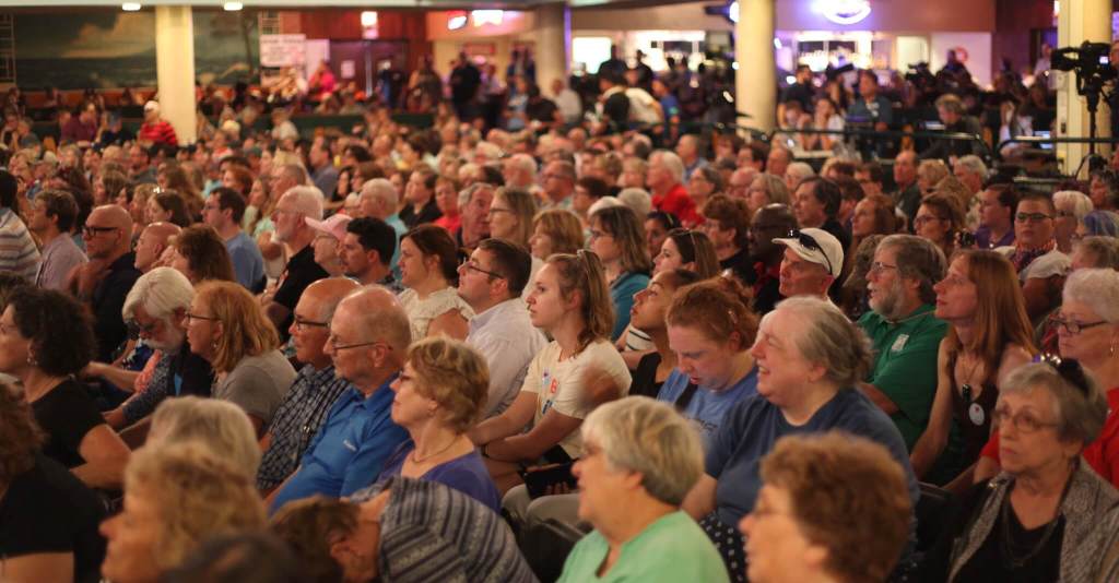 Beto O’Rourke, a former Texas congressman, provided a video message to voters after canceling his appearance here to be in El Paso, Texas, in the wake of the Aug. 3 mass shooting. Prior to the event, candidates gathered for an outdoor vigil in memory of the 22 victims.