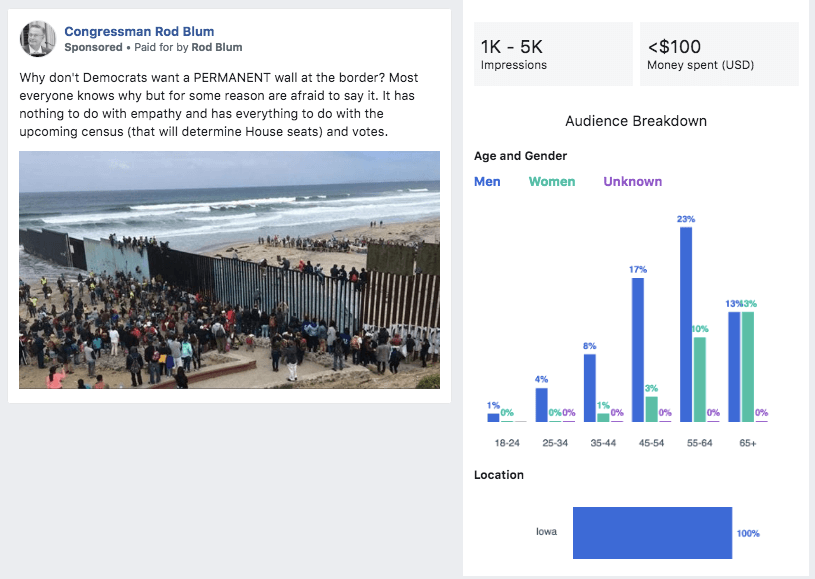 A quick review of the Facebook Ad Archive shows Blum continuing to pay for Facebook ads over the past two months. The “paid for” line simply lists “Rod Blum,” as opposed to the “Blum For Congress” disclaimer used back during the election. These ads also come from his former official Facebook page, Congressman Rod Blum, and not his old political account.