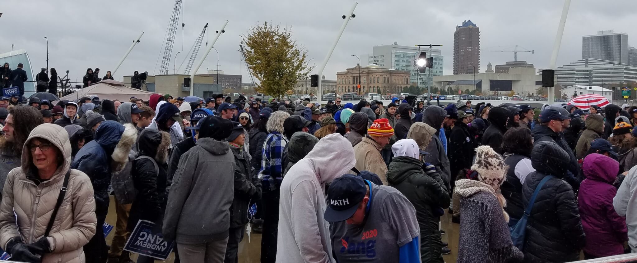 Hundreds of Andrew Yang’s supporters braved the rain for hours on a 43-degree day at Brenton Skating Plaza.