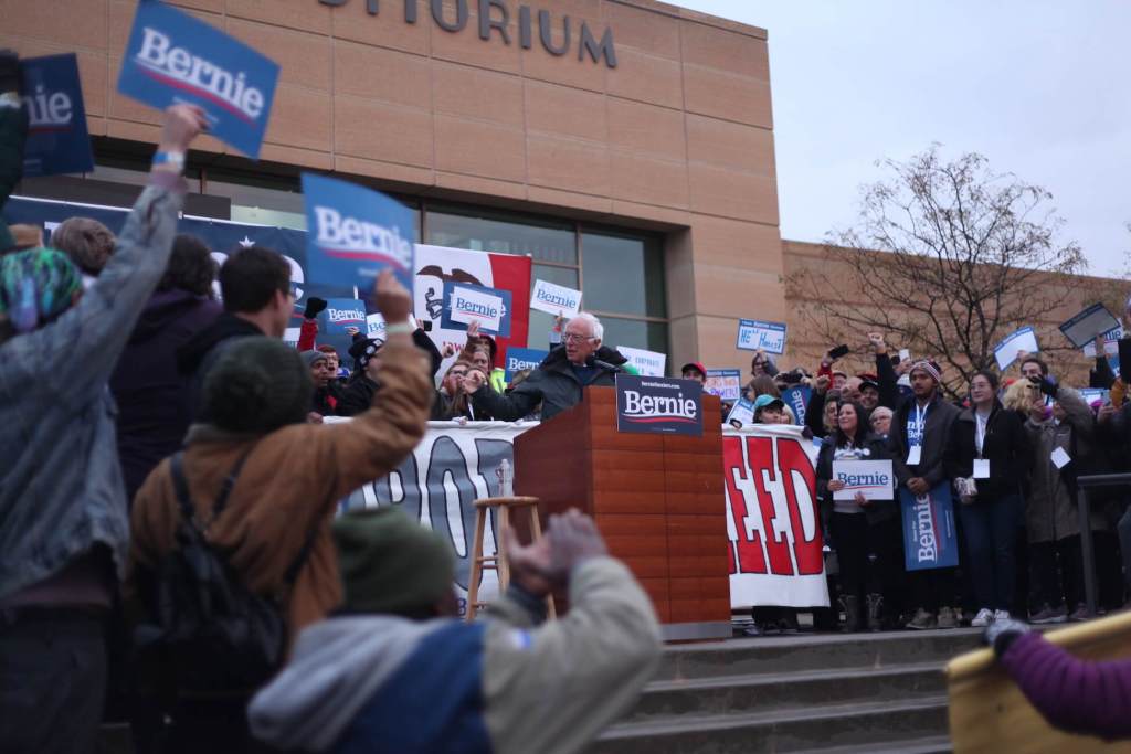 The candidate then marched with his crowd into the event venue, but his supporters are holding a separate event across the street, livestreaming Sanders’ speech into it.