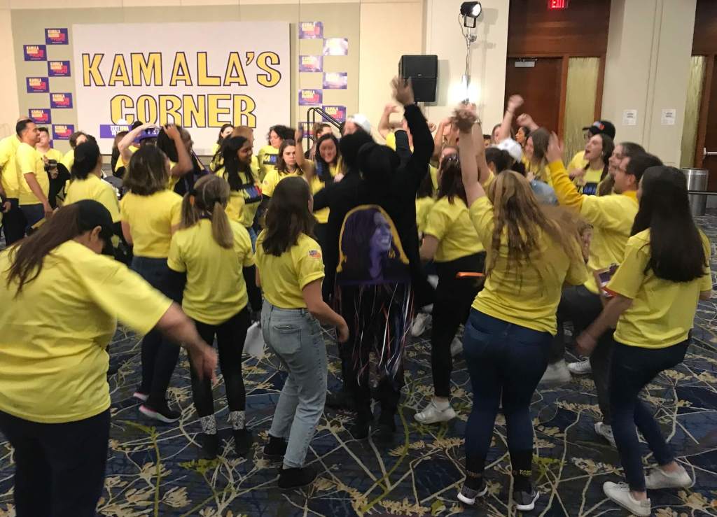 It seemed Harris had practiced some dance moves beforehand, keeping in step with the young musicians rather well. Hundreds of loud and excited staff and supporters cheered her on as she arrived.