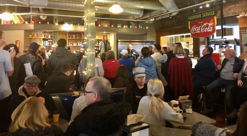 The 3rd District congresswoman stood on a step-stool near the front counter at Smokey Row Coffee as she tried to talk over the background noise of coffee machines and customers.