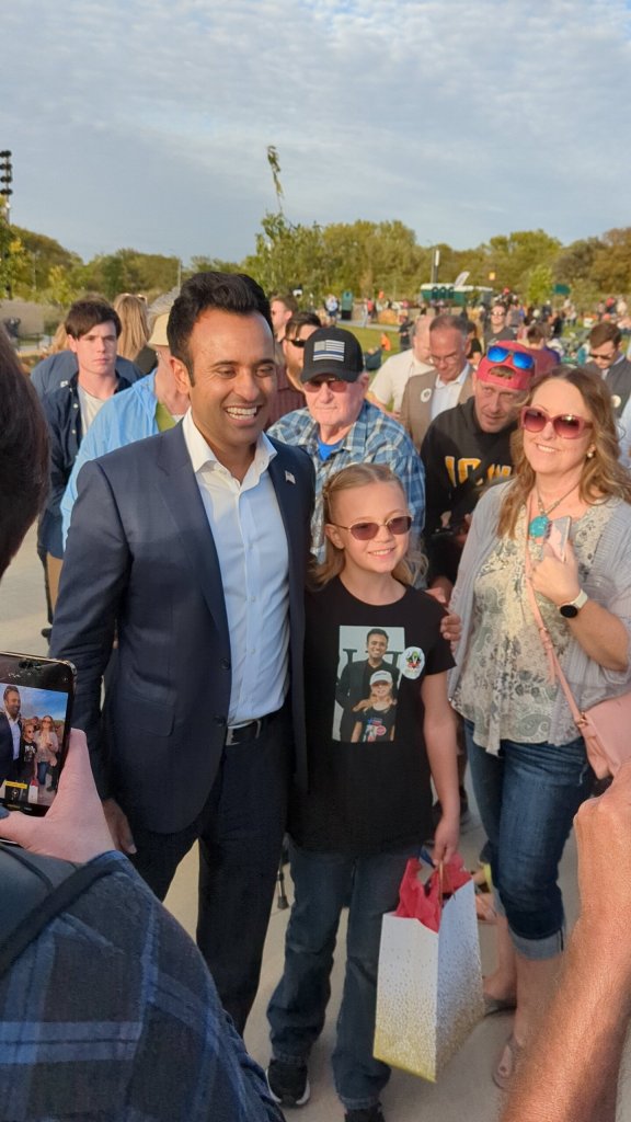 When I entered the scrum, I saw Vivek interacting with a 10-year-old super fan named Lena who was wearing a T-shirt that featured a photo of her and Vivek at another event. After I tweeted out a photo of that, people pointed out that the image on Lena’s shirt featured yet another photo of the duo.