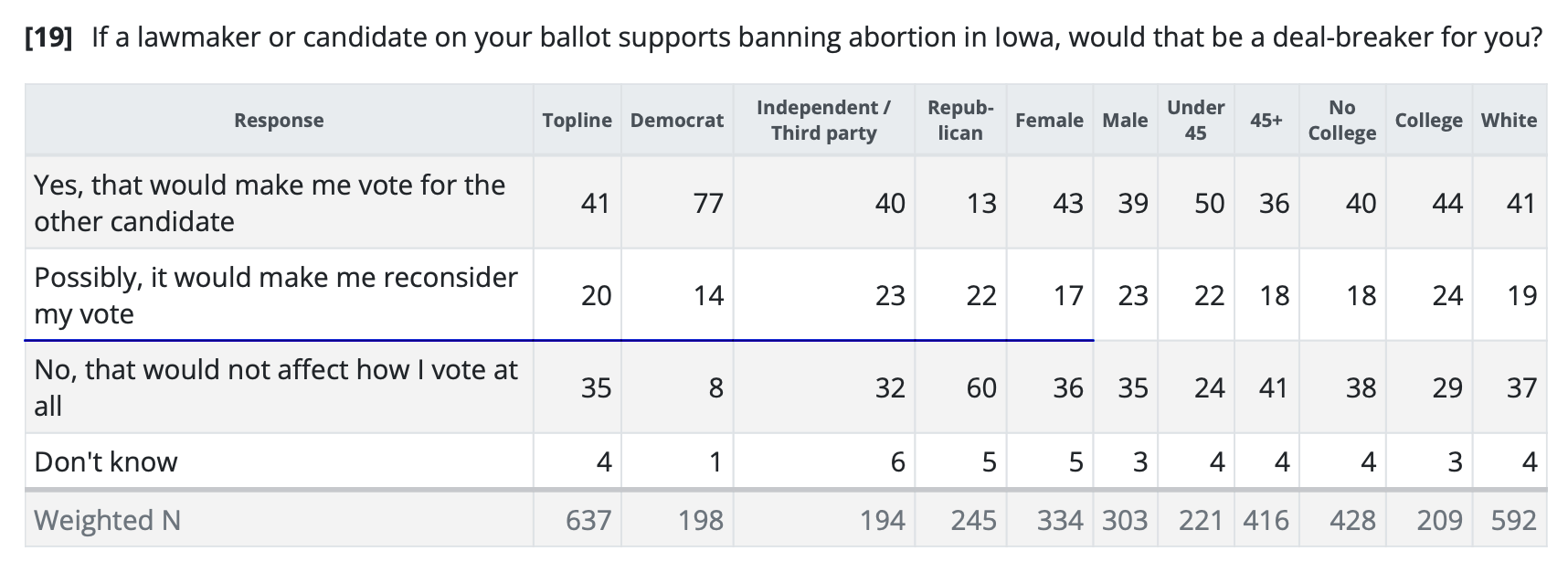 According to the same poll for Starting Line, 41% of respondents said they wouldn’t vote for a candidate supporting banning abortion in Iowa, and 20% said it would make them reconsider their vote. Only 35% of respondents, mostly Republicans, said it wouldn’t affect their vote at all.