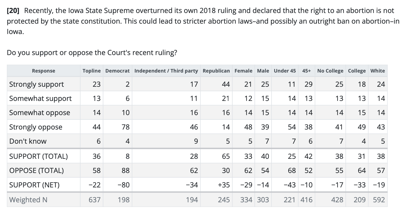 According to Data for Progress polling done for Iowa Starting Line, 58% of respondents oppose the Iowa State Supreme Court’s decision to declare the right to abortion isn’t protected by the state’s constitution. That included 88% of Democrats, 62% of Independents, and 30% of Republicans.