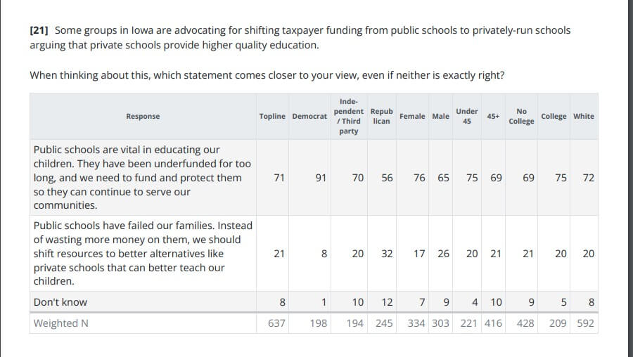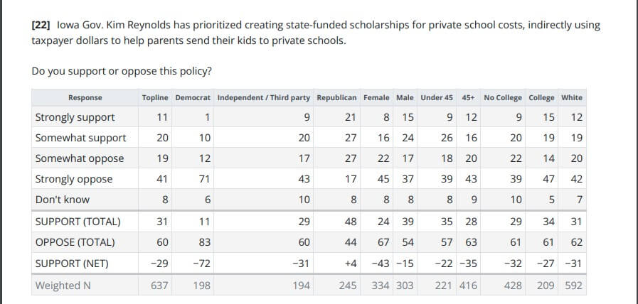 Similarly, a 60% majority of Iowans oppose Reynolds’ proposed policy to create state-funded scholarships for students to attend private schools.