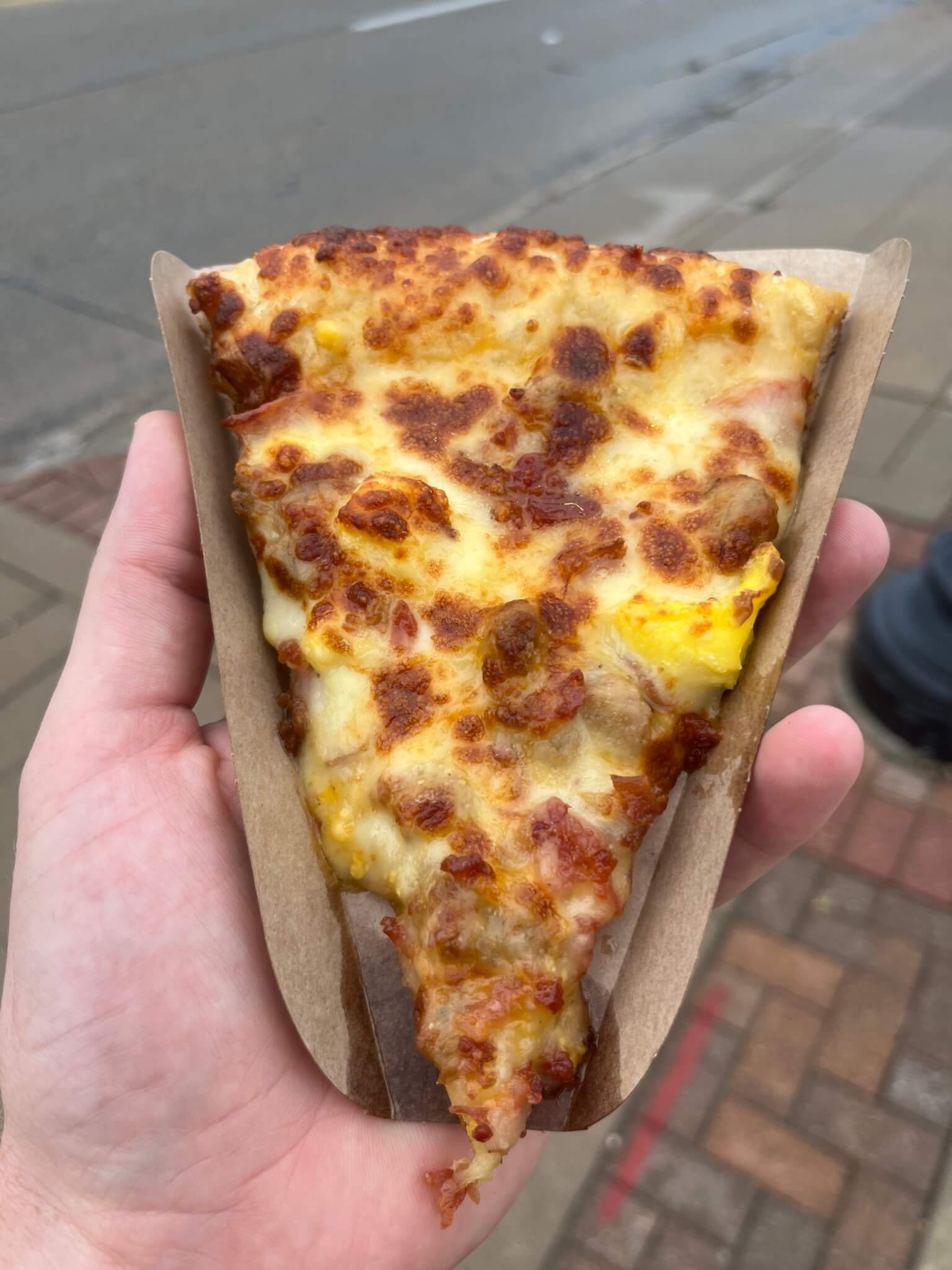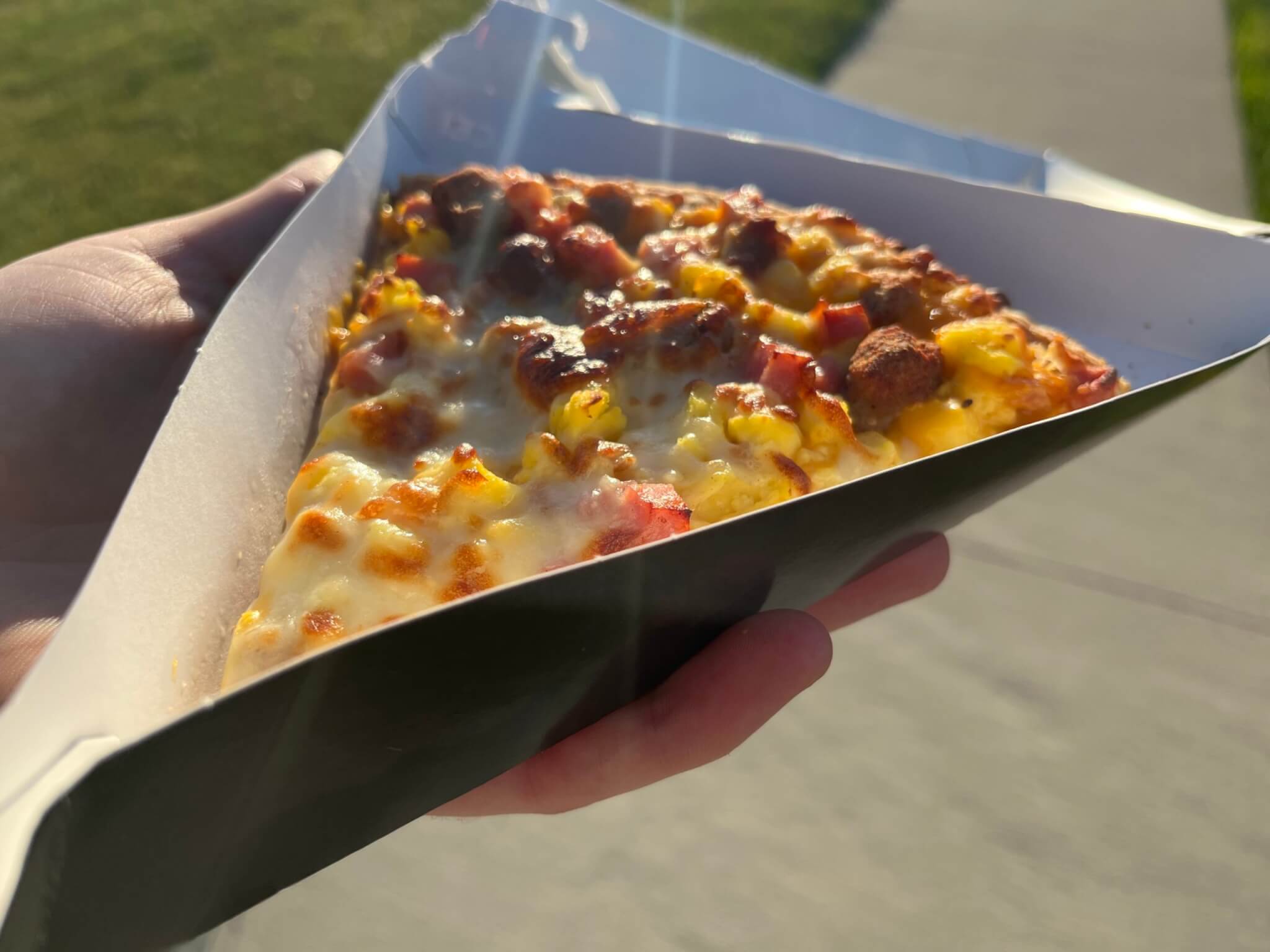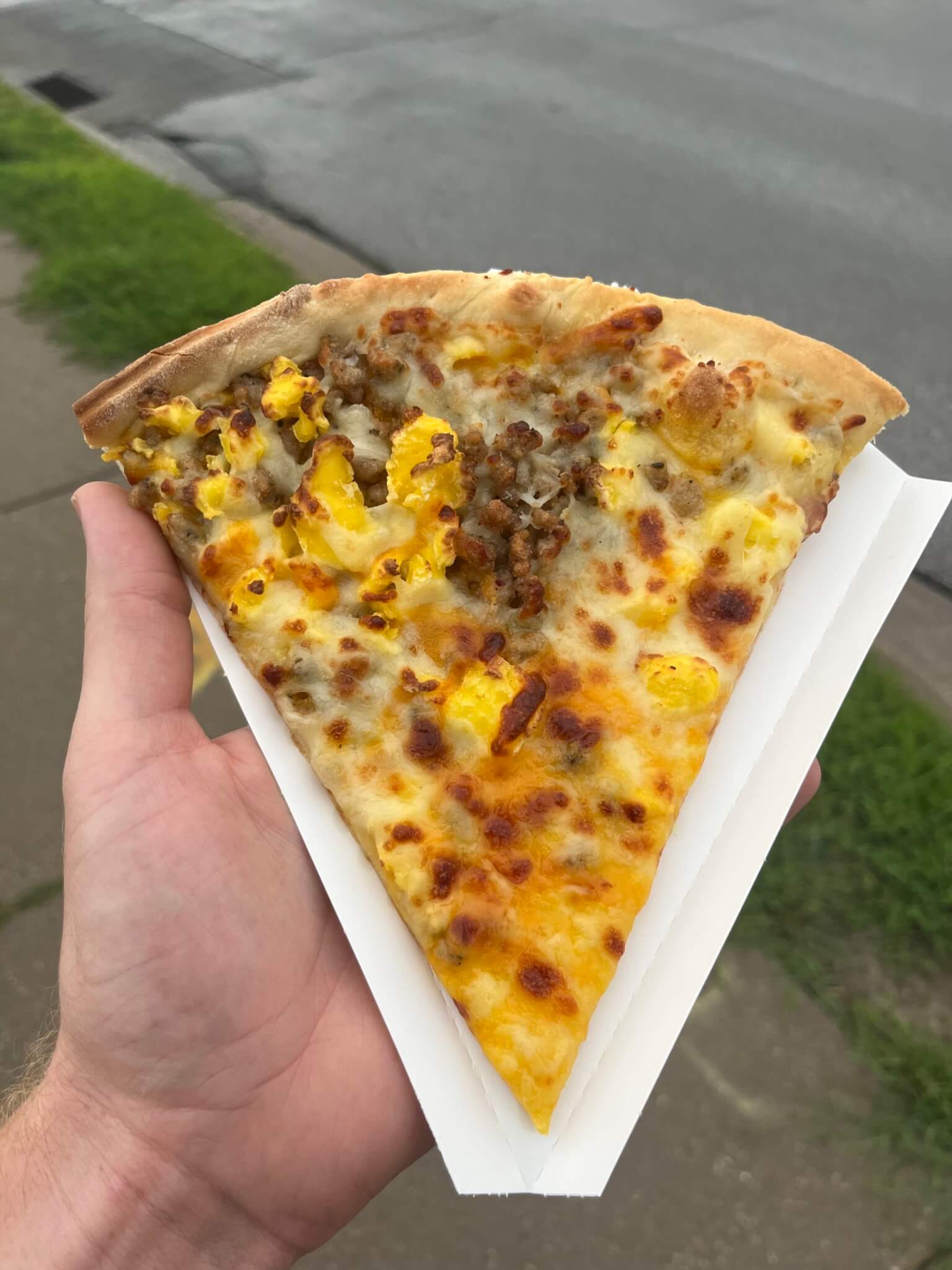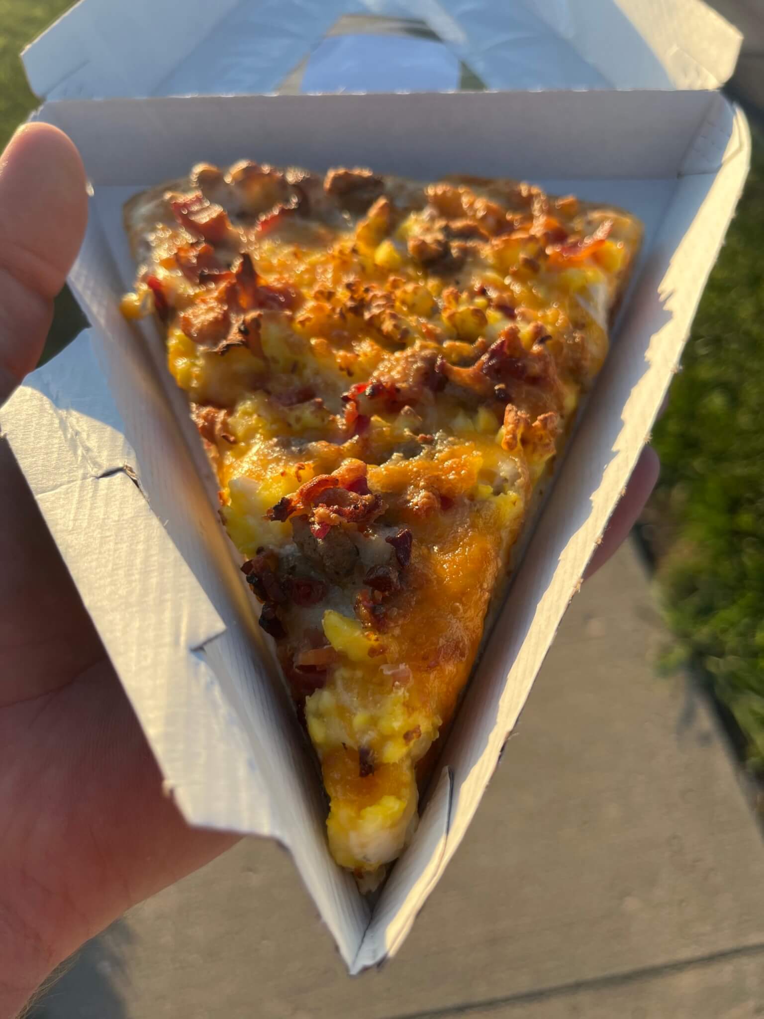 The cheese and gravy create a delicious concoction of thick, creamy, and warm goodness. The sausage had a hint of seasoning while the crust was the best I tried so far. The size of the slice was ideal. It did not feel like too much or too little. The square cut, flawlessly cooked bacon bits were the perfect complement to the softness of the eggs.