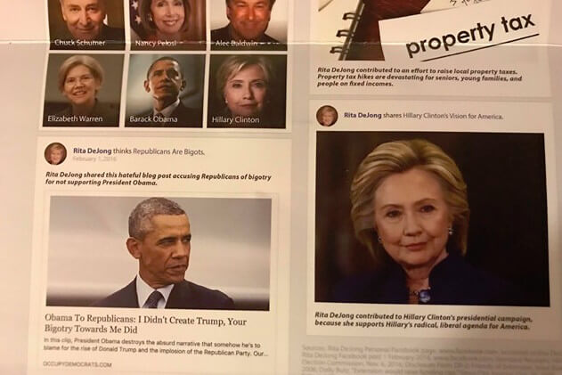A recent mailer focused in on a single story that DeJong shared on Facebook, one in which Barack Obama talked about how Republicans’ knee-jerk reactions to his presidency helped create an environment for Trump to take over their party.
