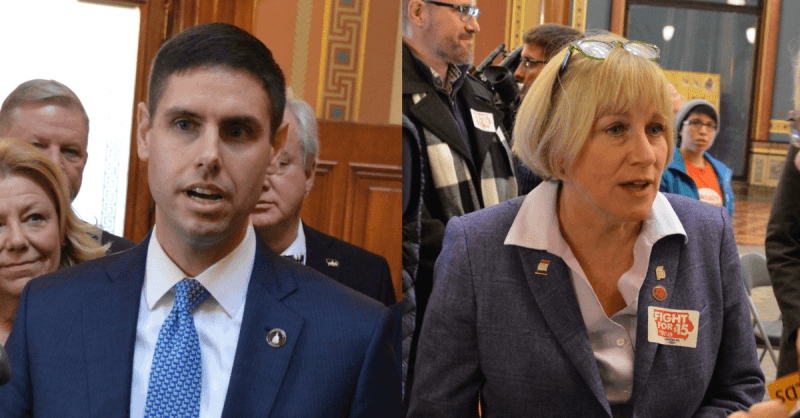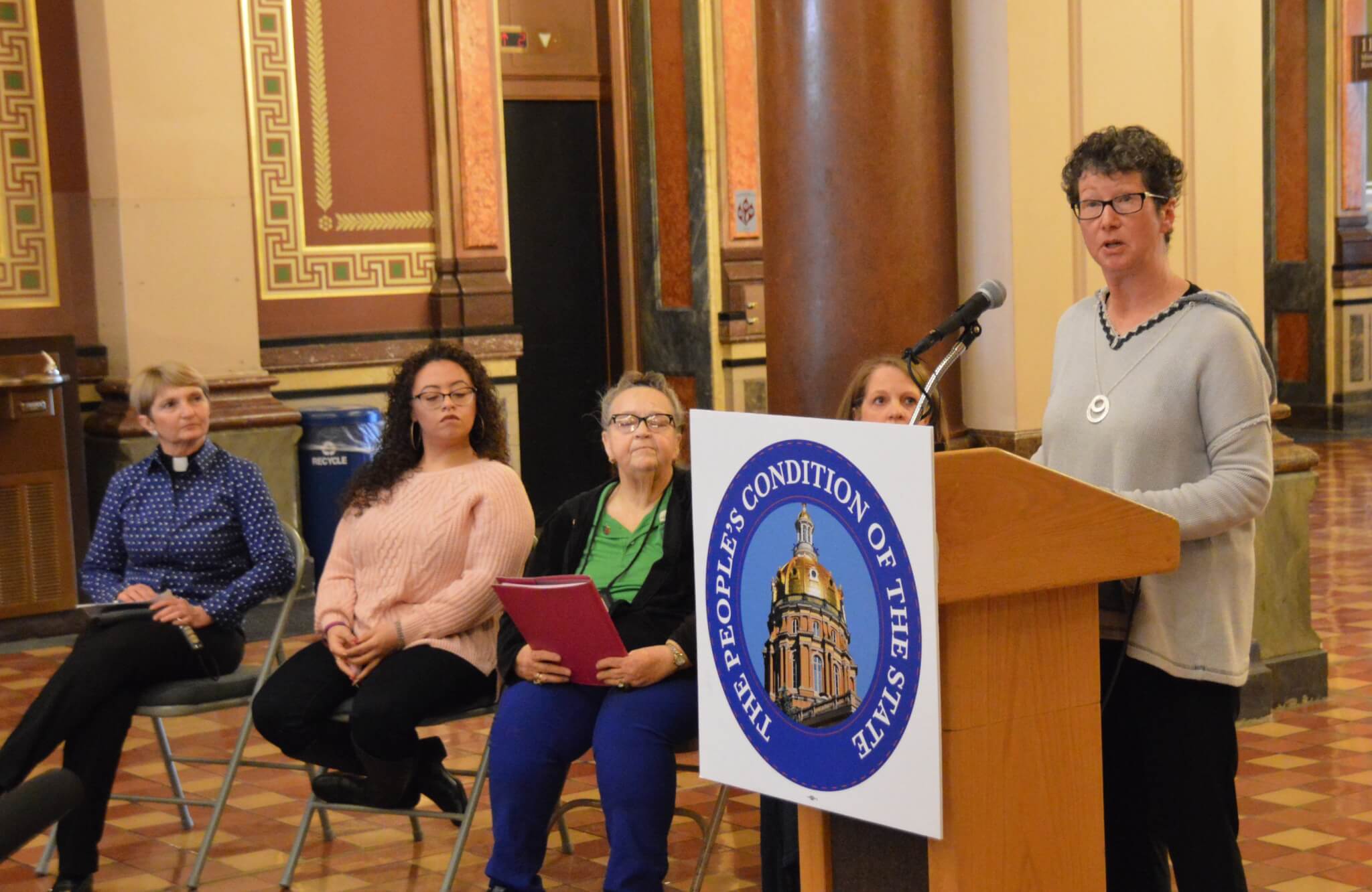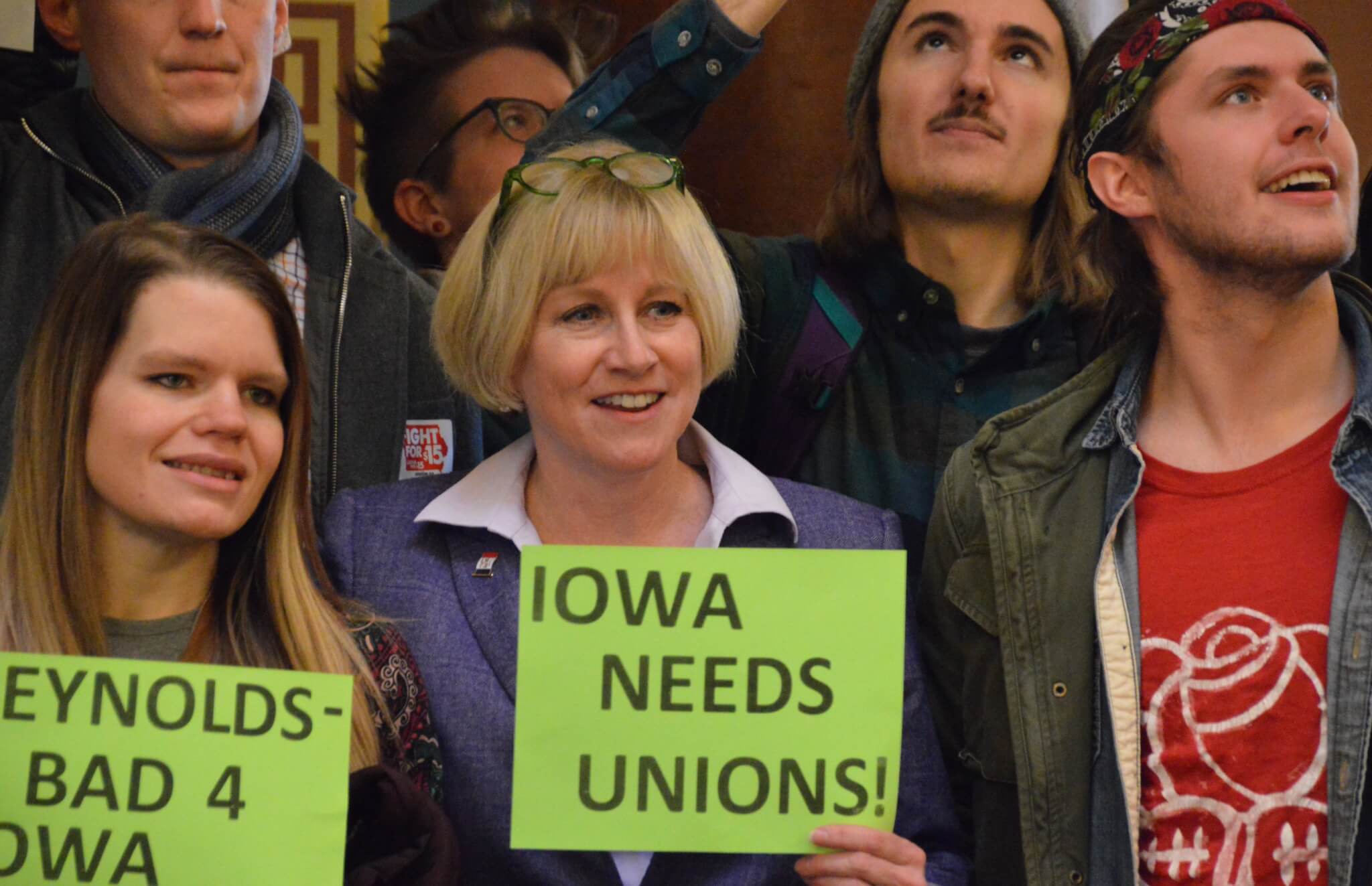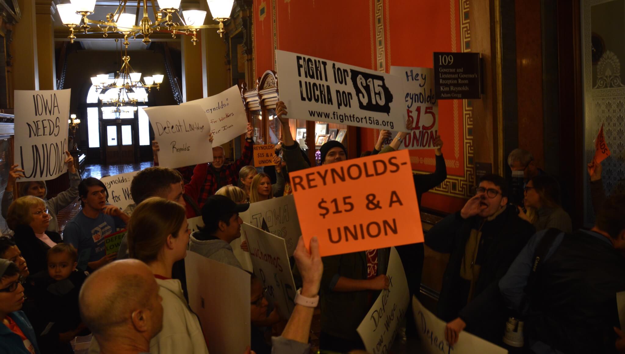 While Boulton sat in the chamber as Reynolds spoke, he wasn’t the only gubernatorial candidate looking to replace the incumbent that was at the Statehouse. Cathy Glasson joined members of Citizens for Community Improvement for some rallies before and after the Condition of the State. The activists focused their message to Reynolds, who they chanted at as she walked back to her office, around $15/hour minimum wage and stronger unions.