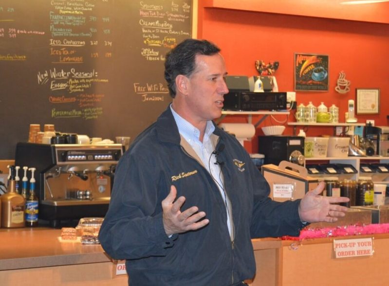 On Monday he stumped at the Java Lounge in Williamsburg, Iowa, a frequent stop during his 2012 campaign. In front of a crowd of about 20 locals, several of which he knew well from last time, Santorum was well-received and spoke on a larger range of topics.