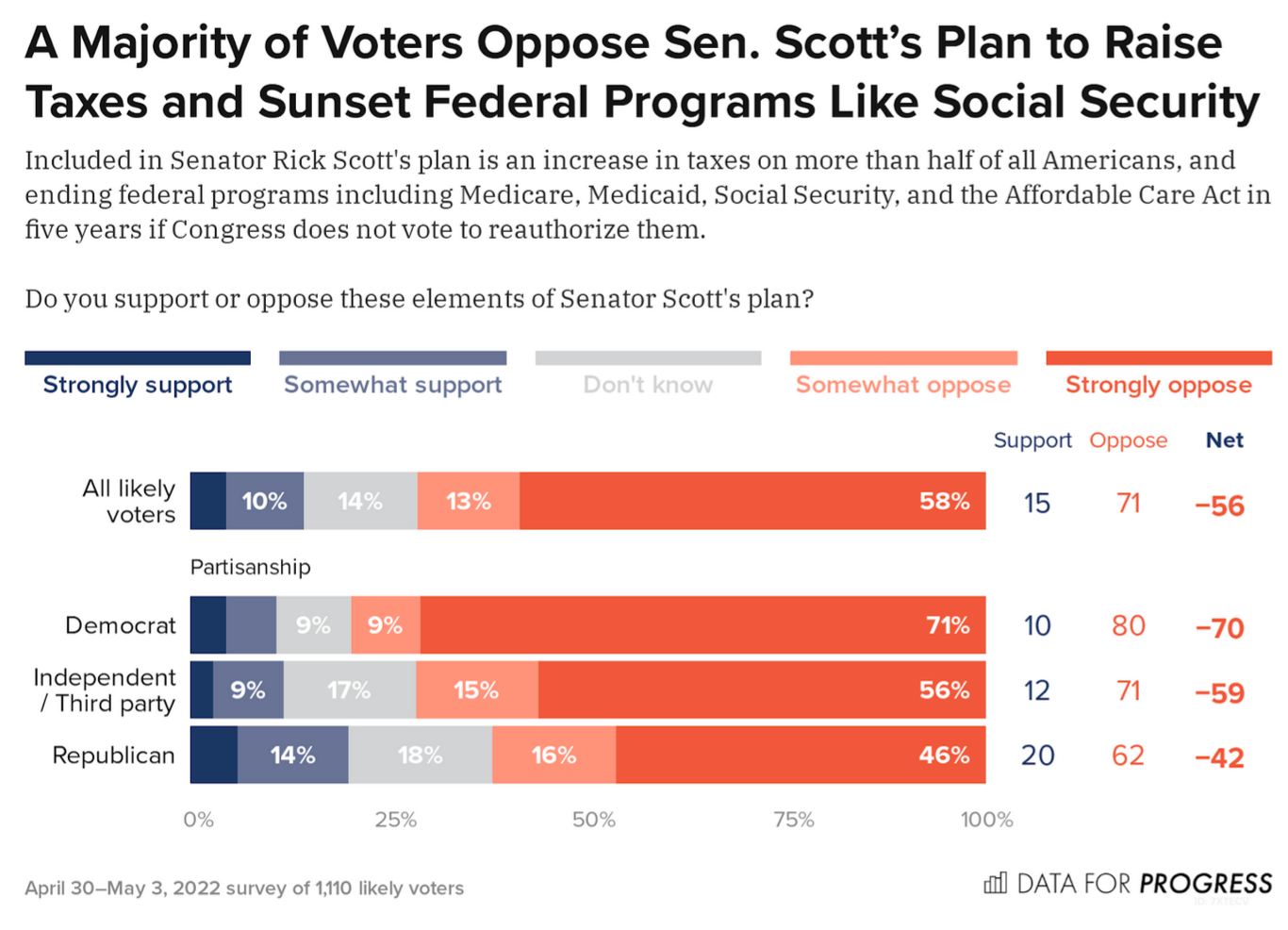 When voters learn about Scott’s plan though, they overwhelmingly oppose it, with 71% of respondents, including 62% of Republicans, opposing Scott’s plan. Only 15% of likely voters support the plan.