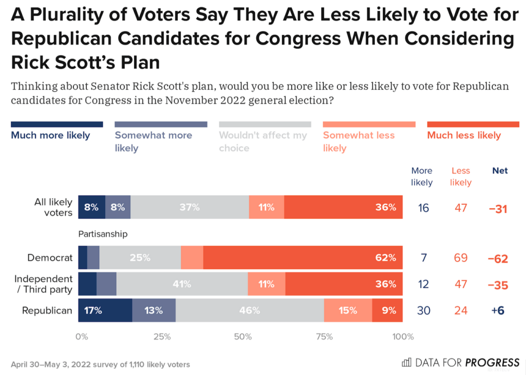 Forty-seven percent of independent voters said Scott’s plan would make them less likely to vote for Republican candidates for Congress in November, while only 12% said it would make them more likely to vote for him and 41% said it wouldn’t impact their choice.
