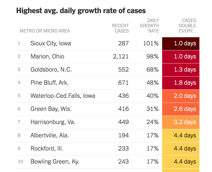 The New York Times has been tracking the way outbreaks happen in cities across the country. The data currently shows the Sioux City metro area, which spans three states, is now the city region with the highest average daily growth rate in the United States. It has a 101 percent daily growth rate, and, on average, the number of cases has doubled daily.